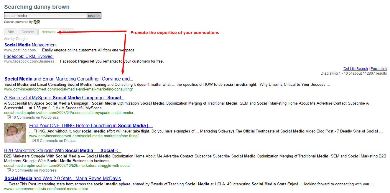 When you set up your Lijit account, you can add all your other profiles from around the web (as seen by the Content Tab on the search result in the image below). This then lets you pull search results from other blogs you might have, or your company website, or video channels, etc.