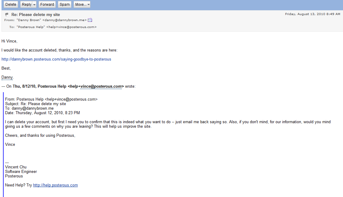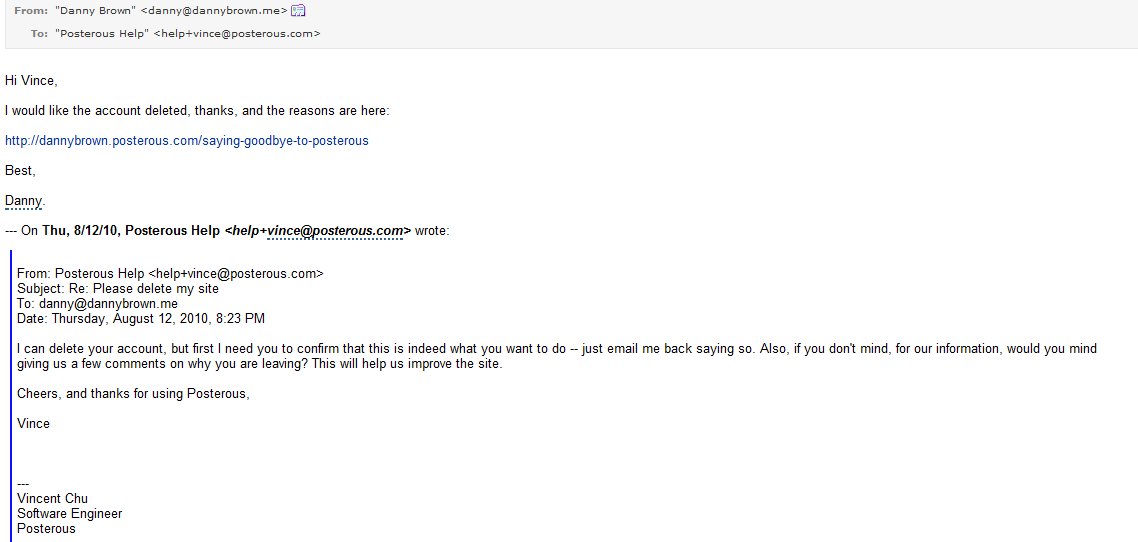 So now I’m pretty frustrated with Posterous. I no longer want to use their service, but I’m still “using it” if you visit my account there. And the company isn’t making it easy for me to stop using their service.